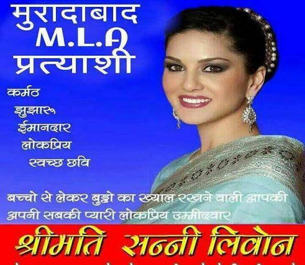 लेकिन जब धक्का लगा जब यूपी के मुरादाबाद विधानसभा सीट से किसी ने फिल्म एक्ट्रेस सनी लियोन को निर्दलीय कैंडिडेट घोषित कर दिया.इतना सुनते है तो खबर आग के जैसे फैल गयी और इतना ही नहीं किसी ने सनी लियोन की फोटो को एडिट करके प्रत्याशी के रूप में शहर में चिपका भी दी. और अब यह तस्वीर सोशल मीडिया पर काफी वायरल हो रही है. आपको बता दे कि यूपी में 11 फरवरी से चुनाव शुरू होने जा रहे हैं ।