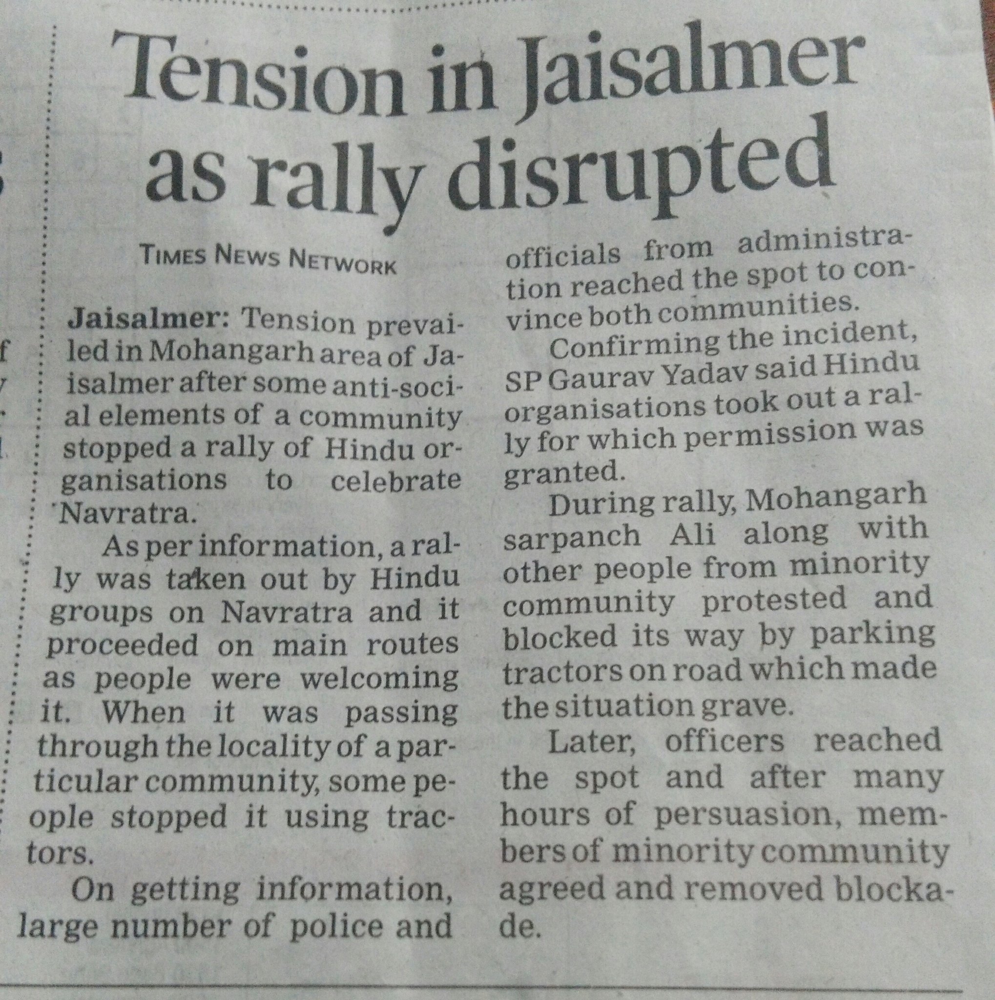 प्राप्त खबर के अनुसार राजस्थान के पाकिस्तान से लगे जिले जैसलमेर के मोहनगढ़ में मुसलमानो ने हिन्दुओ को नवरात्री की पूजा करने और नवरात्री की शोभायात्रा निकालने से रोक दिया